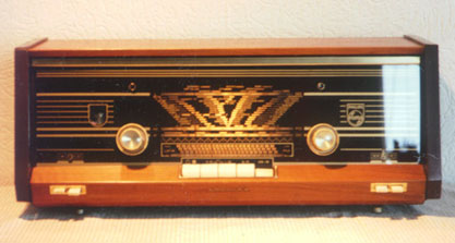 wood & plastic | Dear visitors, my apologies, I forgot the suffix behind the typenumber of this one. "Well, that can't be such a big thing?" you might think. Well it is. Otto Tuil was so kind to give me notice. The thing is like this: There is a B4X23A without any further suffix, this one has a dial with an extra set of stations on the MG band mainly of SouthEast-European, North-African and Middle-Eastern origin, see Otto's B4X23A. The FM Band has a maximum tuning frequency of 104MHz. My B4x23A/74 has a dial with the normal 'Plan de Copenhague' on MG and a FM Range of 108MHz. I Think that Philips released the B4X23A/74 somewhat later when the 104-108MHz FM Band got available for public broadcasting. Apparently the extra stations on the dial weren't that much appreciated as they have dissapeared on this dial. An other possibility is that the B4X23A was aimed for the European market in general and the B4X23A/74 might be a local variant. If you know more: Do not hesitate to mail me. |